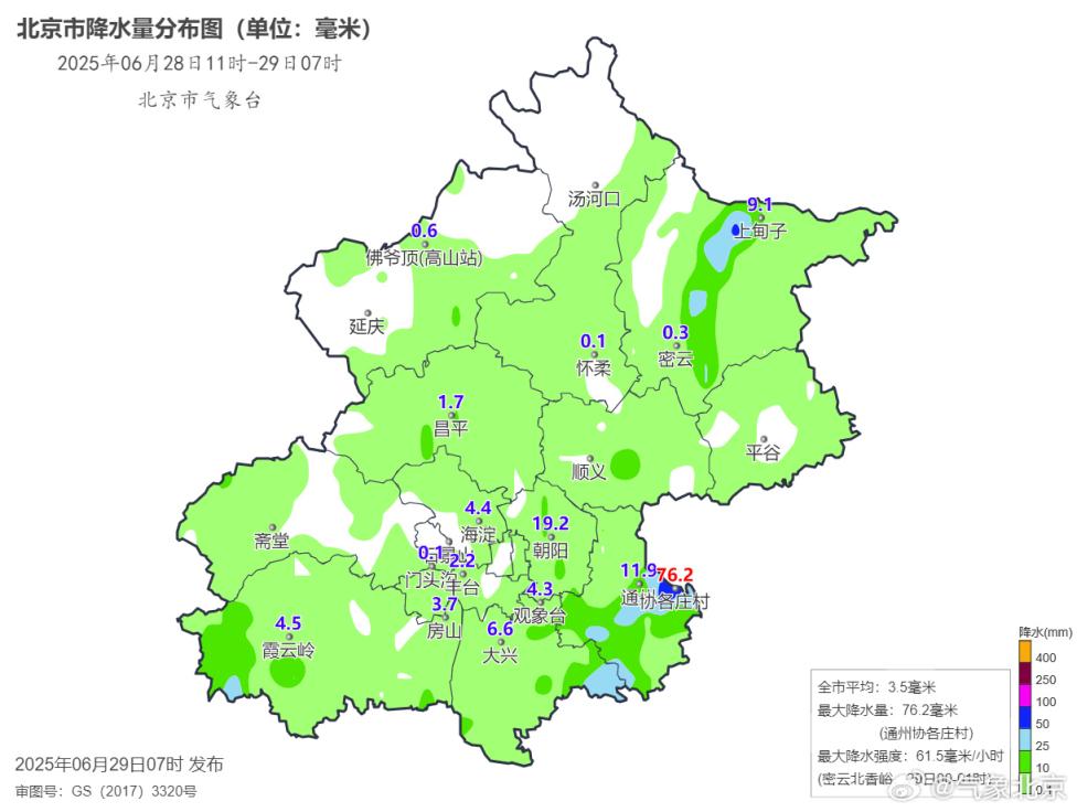 28日11时至29日07时,全市平均降水量3.5毫米,城区平均2.3毫米。最大降水量出现在通州协各庄村76.2毫米(最近一小时降雨57.4毫米)。