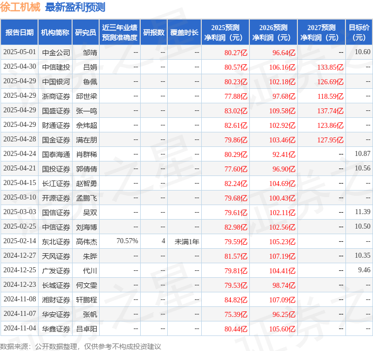 徐工机械(000425) 公司发布24年报及25年一季报,业绩表现优异: 2024年公司实现收入916.6亿元、同比-1.28%,其中海外收入416.87亿元、同比+12%,海外收入占比45.48%、同比+5.39pct。2025Q1公司实现收入268.15亿元、同比+10.92%。 净利润进一步增长,2024年公司实现归母净利润59.76亿元、同比+12.2%,扣非归母净利润57.62亿元、同比+28.14%;25Q1归母净利润20.22亿元、同比+26.37%,扣非归母净利润20.07亿元、同比+36.88%。 盈利能力稳步提升,2024年公司毛利率22.5%、同比+1.7pct,归母净利率6.5%、同比+0.8pct;24年期间费用率15.1%、同比+1.4pct,主要受财务费用率同比提升1.3pct影响赢正通,24年汇兑损失9.6亿元。 25Q1公司毛利率22.1%、同比+0.5pct,归母净利率7.5%、同比+0.9pct;25Q1期间费用率12.0%、同比-1.9pct,主要系财务费用率-1.9pct。 现金流持续改善,2024年公司经营性现金流净额57.2亿元、同比+60.18%,25Q1经营性现金流净额8.26亿元,24年同期仅为2.31亿元;同时24年公司资产负债率压降2.07pct,经营质量明显改善。 产业结构均衡,板块布局优势不断凸显: 公司聚焦“5+1”产业布局主线,坚持做强核心工程机械产业,做精零部件产业,培育战略新产业,转型升级现代服务业,打造出了“传统主机担当突破+战略新产业异军突起+核心零部件发力支撑”的最均衡、极具成长潜力的板块布局,支撑公司表现出更强大的逆周期抗风险能力。 今年4月公司公告收购徐州徐工重型车辆有限公司51%股权,通过整合宽体自卸车等产业,加快打造矿山机械“第二曲线”,进一步扩大矿山机械的成套化、系列化产品竞争优势。且签署业绩承诺,标的公司25-27年承诺归母净利润1.4、1.6、1.8亿元,一定程度增厚公司利润,但战略意义更为突出。 持续抓好“三大增量”,重点突破“三个专项”: 刀刃向内,以“三个专项”打赢高质量攻坚战,体现为压降应收账款、优化存货、提升毛利率;创新突破,以“三大增量”把握结构性新机遇,体现为高效推进国际化主战略、加快后市场创造性实践精准落地、科技创新助推新能源产业持续领跑;2025年预计营业收入同比增长超10%,净利润、现金流增幅超收入增幅。 高度重视投资者回报: 2024年公司发布行业首份《全球投资者未来三年(2025-2027)回报计划》,以高质量的发展业绩回报广大投资者。2024年度现金分红预计20.8亿元,回购股份并用于注销3-6亿元。此外,2025年4月7日公司公告回购股份18-36亿元,彰显对未来发展的信心和对公司价值的认可。 盈利预测:考虑到国内工程机械行业复苏进程等因素影响,我们调整盈利预测,预计公司2025-2027年归母净利润分别为79.1/100.8/133.6亿元(25-26年前值分别为81.57、107.19亿元),对应PE估值分别为13.2/10.3/7.8X,维持“买入”评级。 风险提示:政策风险,市场风险,汇率风险,原材料价格波动的风险,公司国际市场经营风险等。