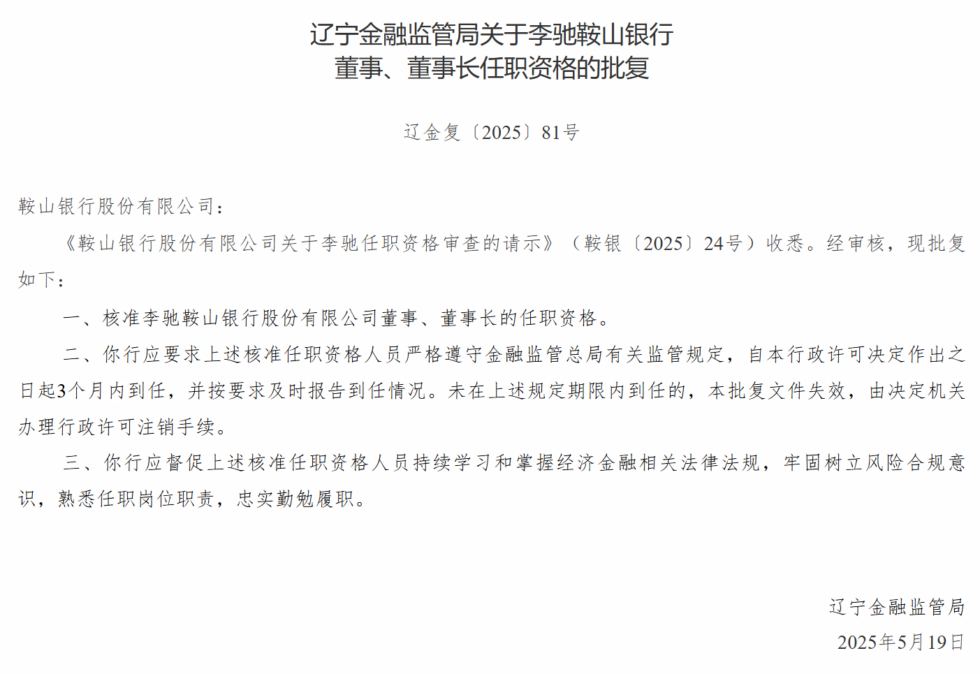 批复显示,鞍山银行应要求上述核准任职资格人员严格遵守金融监管总局有关监管规定,自本行政许可决定作出之日起3个月内到任,并按要求及时报告到任情况。未在上述规定期限内到任的,本批复文件失效,由决定机关办理行政许可注销手续。