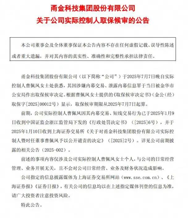 2025年7月8日,甬金股份(603995.SH)公告披露,公司实际控制人曹佩凤因涉嫌内幕交易、泄露内幕信息罪,被金华市公安局作出取保候审决定。