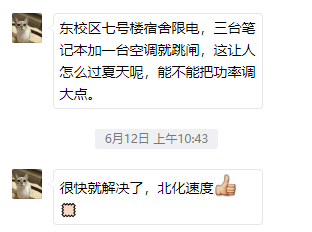 “收到,马上落实!”“收到,马上安排人员维修”安信策略,这些都不是口号——不管是树洞的吐槽还是企业微信后台的诉求,北化后勤总是第一时间响应,及时研判处理。做到高质量、高效率响应师生诉求。