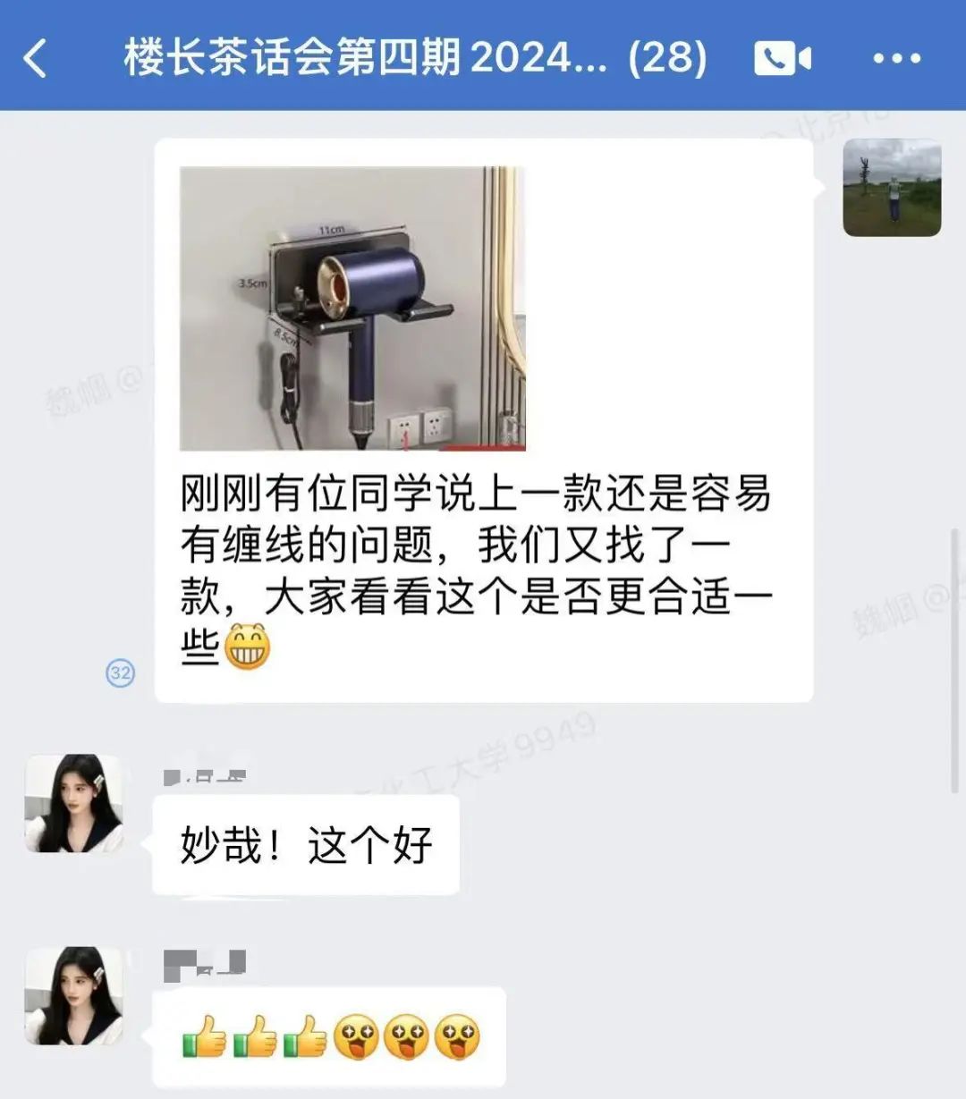 在楼长茶话会上,有同学提出吹完头发梳头发的时候,吹风机无处安放,后勤保障部经过对多个学校调研,并将调研的结果在楼长茶话会群里和同学讨论,最终在半个月的时间内,将支架全部安装完成。